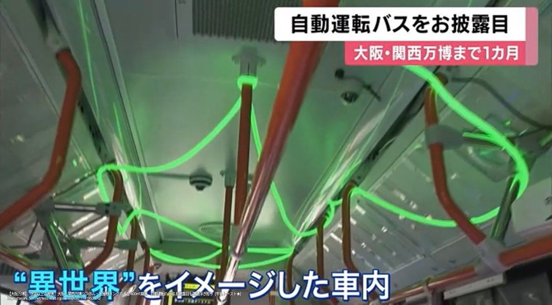 来場者を会場に運ぶ、異世界をイメージしたEVバスのデザインが、13日にお披露目された。車内を見ると、天井には緑色のLEDライトが張り巡らされ、床は青色に染められている。