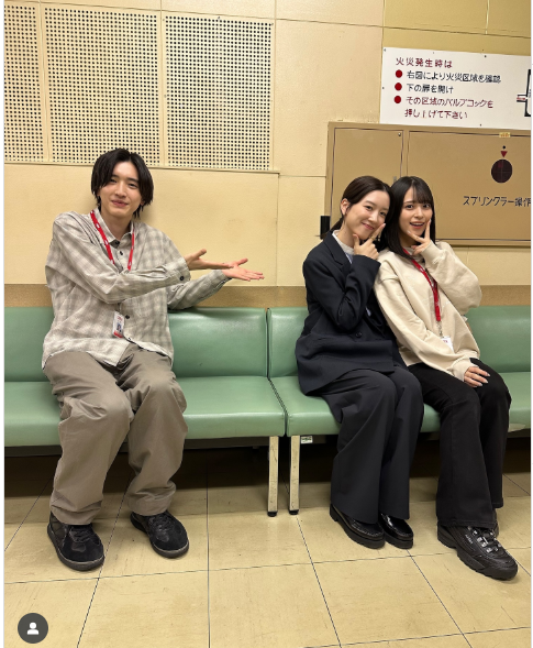 公式SNSは「撮影現場から華&AD本橋&紗矢のオフショット ニュースゲートの若手チーム 今週の放送も3人の活躍をお楽しみに…」とつづり、永野芽郁、道枝駿佑(なにわ男子)、佐々木舞香(=LOVE)の3ショットを投稿。永野と佐々木は寄り添いポーズを決め、少し離れた場所に座る道枝がその様子を紹介しているような微笑ましい一枚となっている。