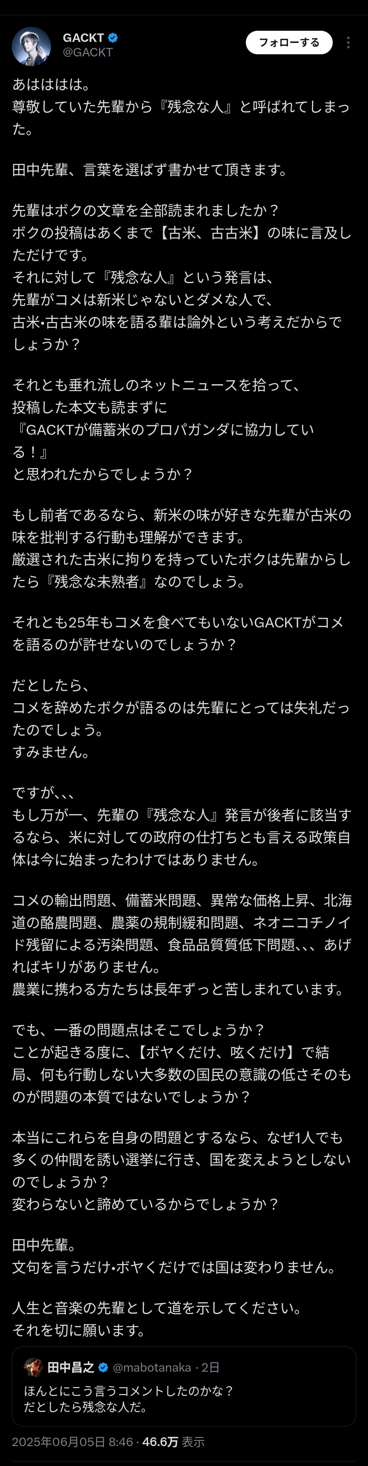 GACKTは田中の投稿に「あはははは。尊敬していた先輩から『残念な人』と呼ばれてしまった」と反応。「先輩はボクの文章を全部読まれましたか? ボクの投稿はあくまで【古米、古古米】の味に言及しただけです。それに対して『残念な人』という発言は、先輩がコメは新米じゃないとダメな人で、古米・古古米の味を語る輩は論外という考えだからでしょうか? それとも垂れ流しのネットニュースを拾って、投稿した本文も読まずに『GACKTが備蓄米のプロパガンダに協力している!』と思われたからでしょうか?」と問いかけ「もし前者であるなら、新米の味が好きな先輩が古米の味を批判する行動も理解ができます」とした。